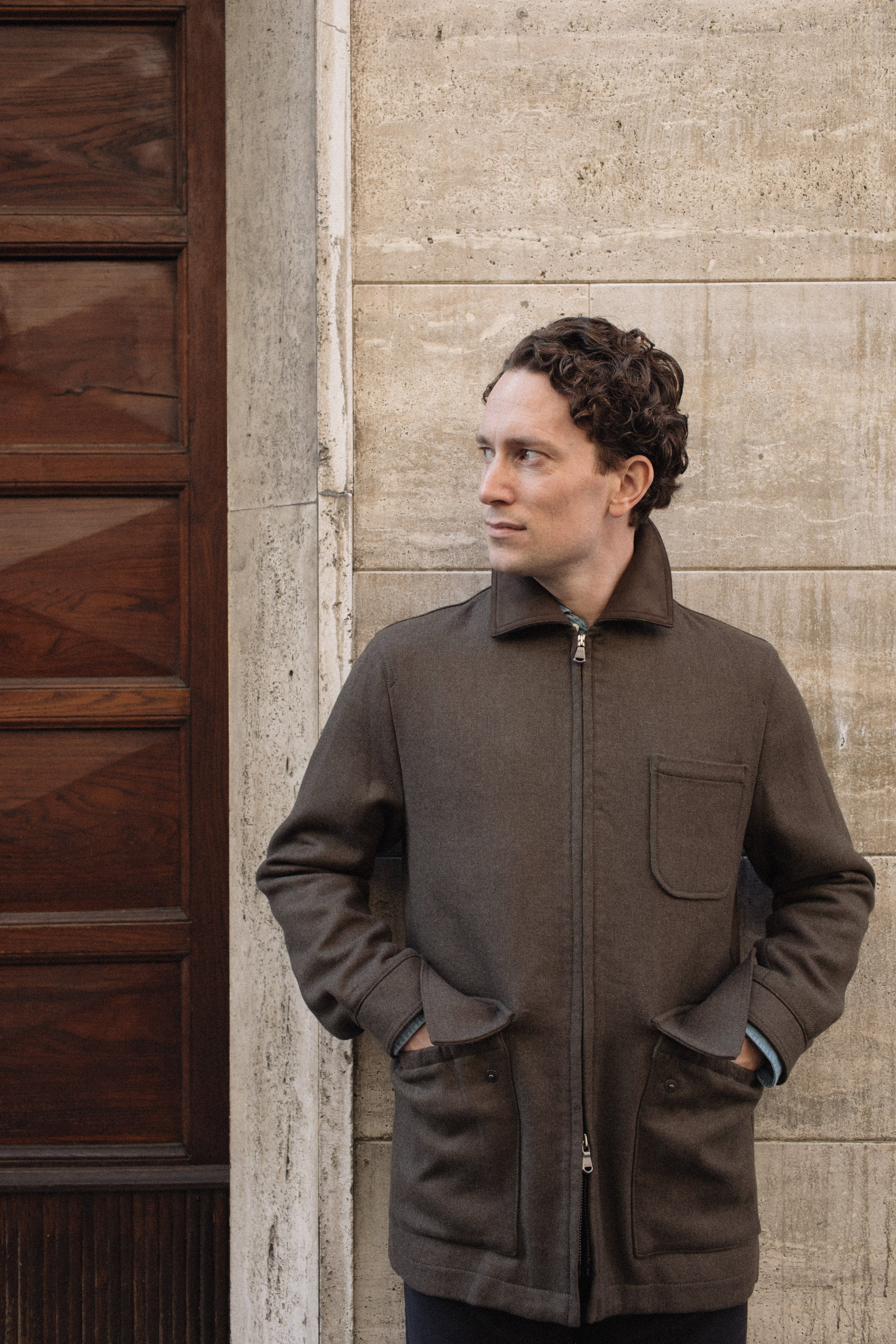 Sport Jacket Wool Brown Glen Plaid Green Overcheck (Coming Soon), Raglan Sleeve Polo Wool-Cashmere Brown, University Stripe OCBD Shirt, Navy Wool Stripe Tie, Charcoal Flannel Tailored Trousers, Unley Brown Suede Loafers