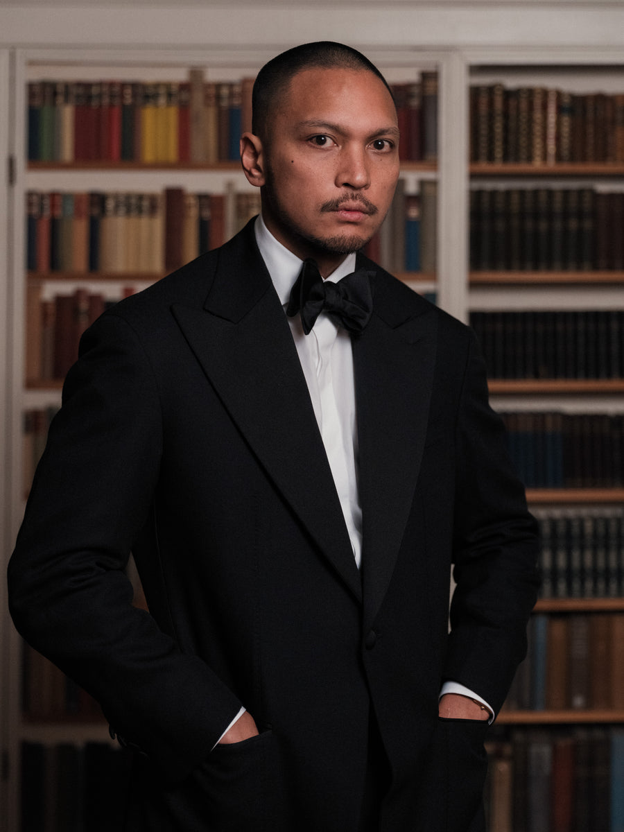 Fabio wears a MTM Single Breasted Peak Lapel Tuxedo, Spread Collar Covered Placket Shirt, Faille Silk Cummerbund and Faille Silk Bow Tie.