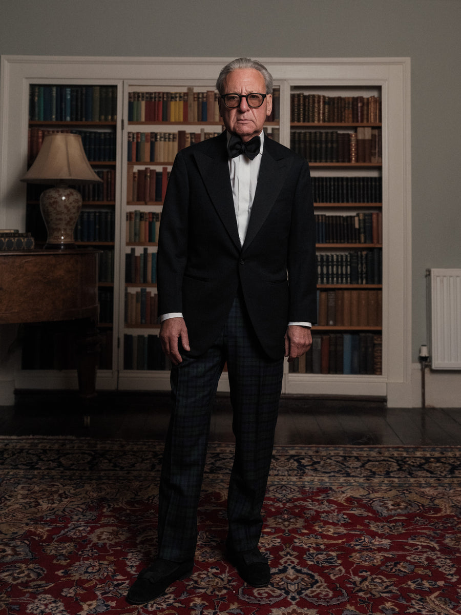 Kevin wears a MTM Single Breasted Peak Lapel Tuxedo, Black Watch Check MTM Trousers, Spread Collar Covered Placket Shirt and Faille Silk Bow Tie.