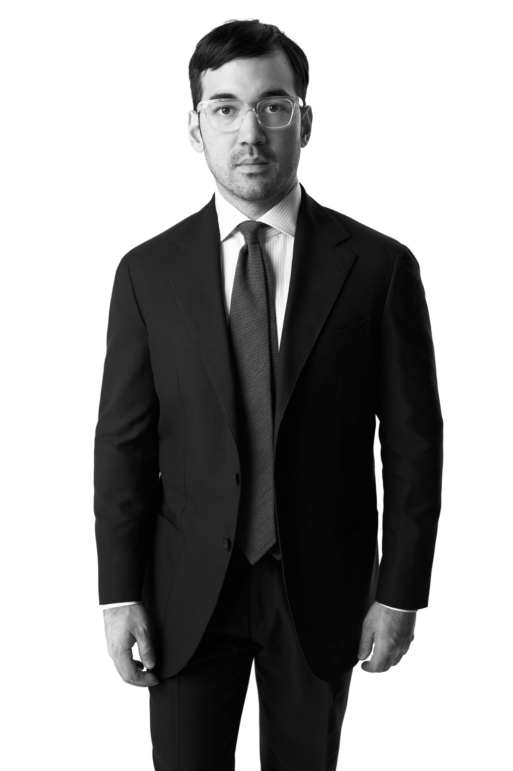Andrew wears an MTM Single Breasted Suit in AIT-069, Sky Blue Stripe Poplin Spread Collar Shirt, Charcoal Grenadine Tie and Crockett & Jones for Anglo-Italian Studridge Black Calf Loafers.