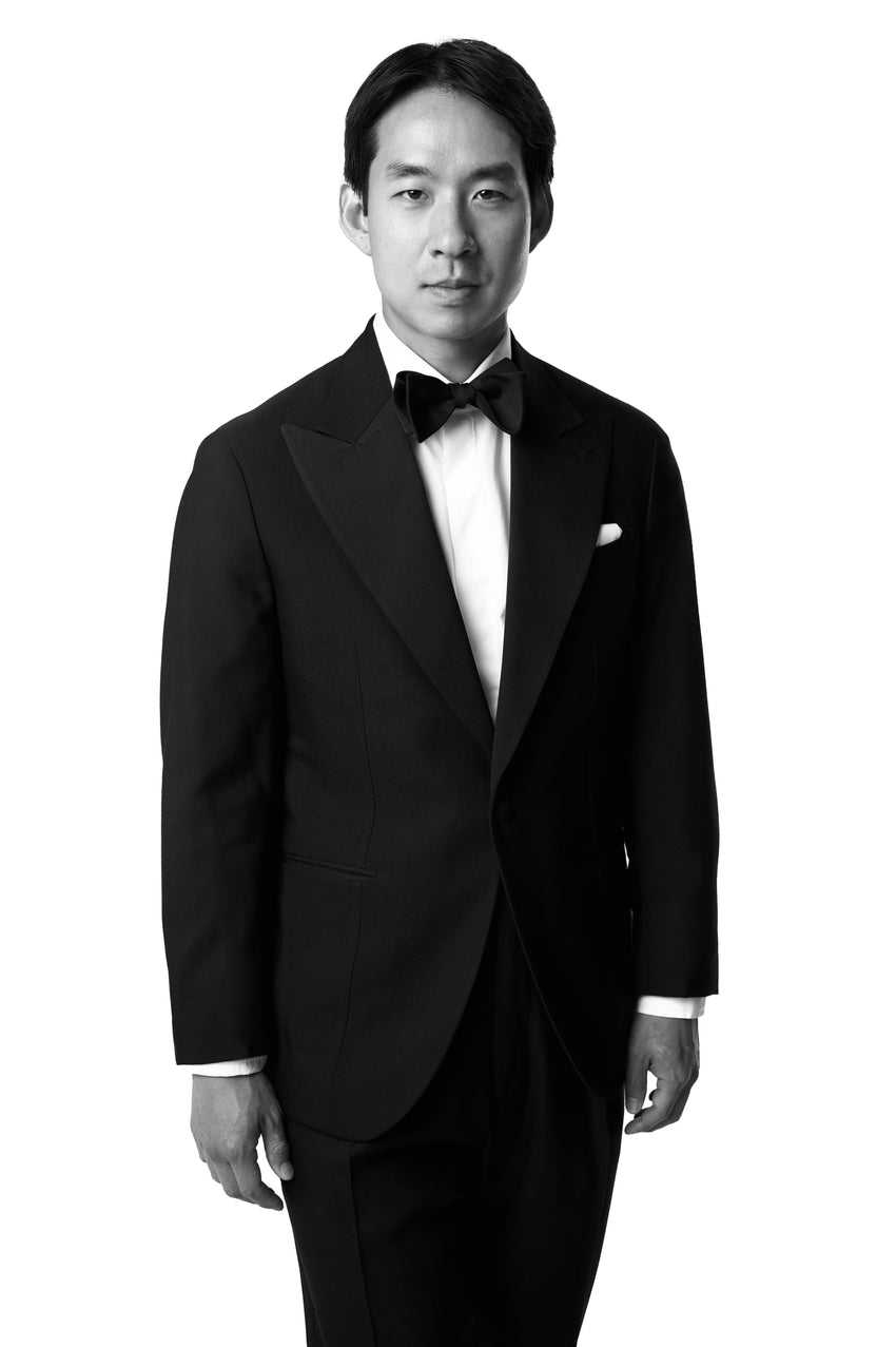 Jeon wears an MTM Single Breasted Peak Lapel Tuxedo, MTM Covered Placket Spread Collar Dress Shirt, Faille Silk Bow Tie and Crockett & Jones for Anglo-Italian Studridge Black Calf Loafers.