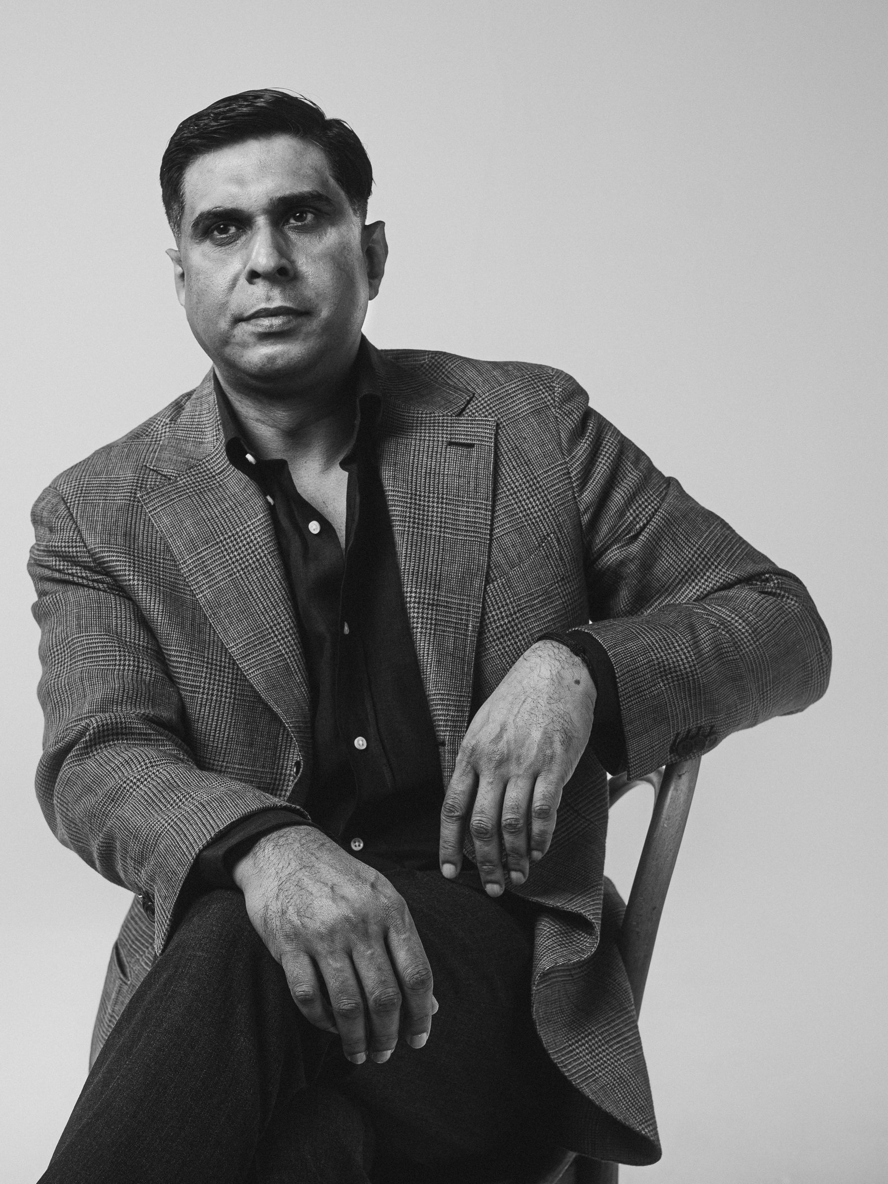 Gulam wears a Made-To-Measure Single Breasted Jacket in AIT-090, Navy OCBD Shirt, Made-To-Measure Charcoal High-Twist Wool Tailored Trousers and Crockett & Jones for Anglo-Italian Studridge Brown Suede Loafers.