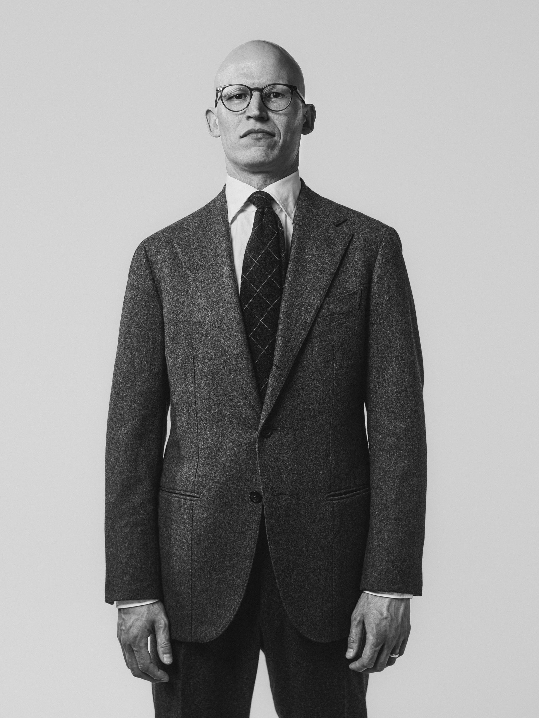 Oli wears a Made-To-Measure Single Breasted Suit in Charcoal Flannel, White Poplin Spread Collar Shirt, Charcoal Grey Windowpane Check Cashmere Tie and Crockett & Jones for Anglo-Italian Bradbourne Brown Suede Loafers.