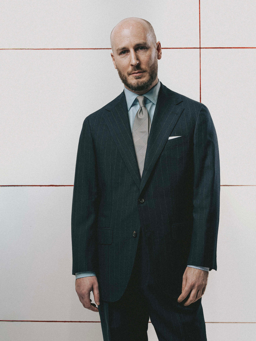 James wears an MTM Single Breasted Suit in Navy Chalkstripe High-Twist Wool, MTM Powder Blue Spread Collar Shirt, Grey Glen Plaid Dry Silk Tie and Crockett & Jones for Anglo-Italian Bradbourne Black Calf Loafers