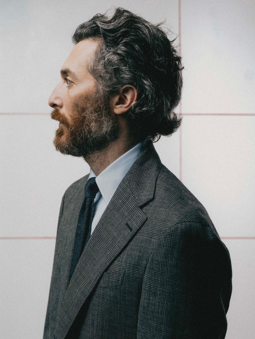 Robin wears a Charcoal Wool-Mohair Glen Plaid Double Breasted Suit, Mid-Blue Bengal Stripe Cotton Poplin Spread Collar Shirt, Ink Grey Stripe Linen Knit Tie and Crockett & Jones for Anglo-Italian Unley Brown Suede Loafers