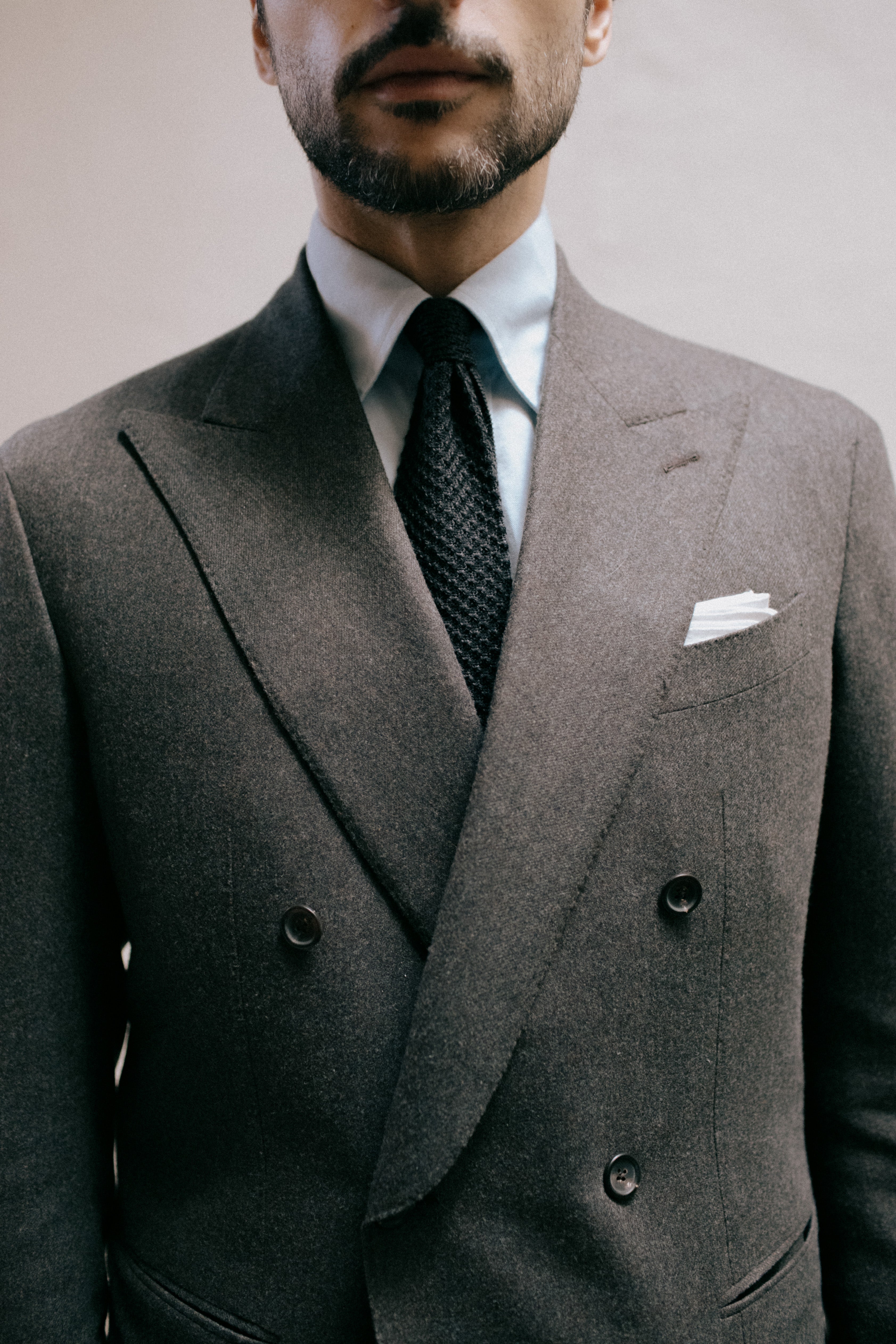 Fabio wears a MTM Double Breasted Suit in Dark Brown Flannel, Point Collar Shirt Cotton Poplin Sky Blue, Charcoal Wool Knit Tie and Crockett & Jones for Anglo-Italian Studridge Black Calf Loafers.