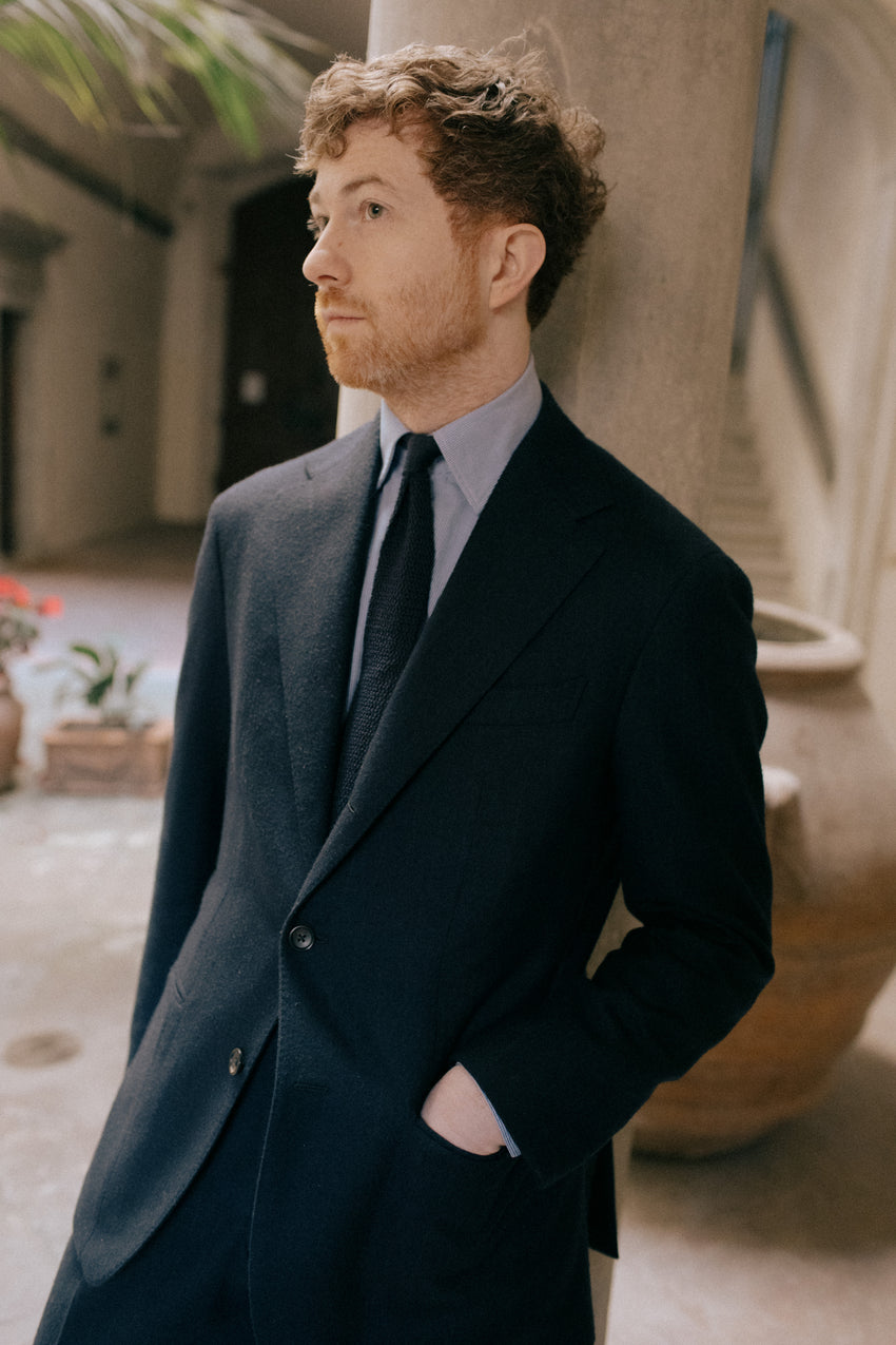 Andrew wears a MTM Single Breasted Jacket in AIT-077, Navy Zip-Through Cardigan, MTM Dark Navy Cavalry Twill Tailored Trousers and Brown Suede Crepe Sole Mountain Boots.