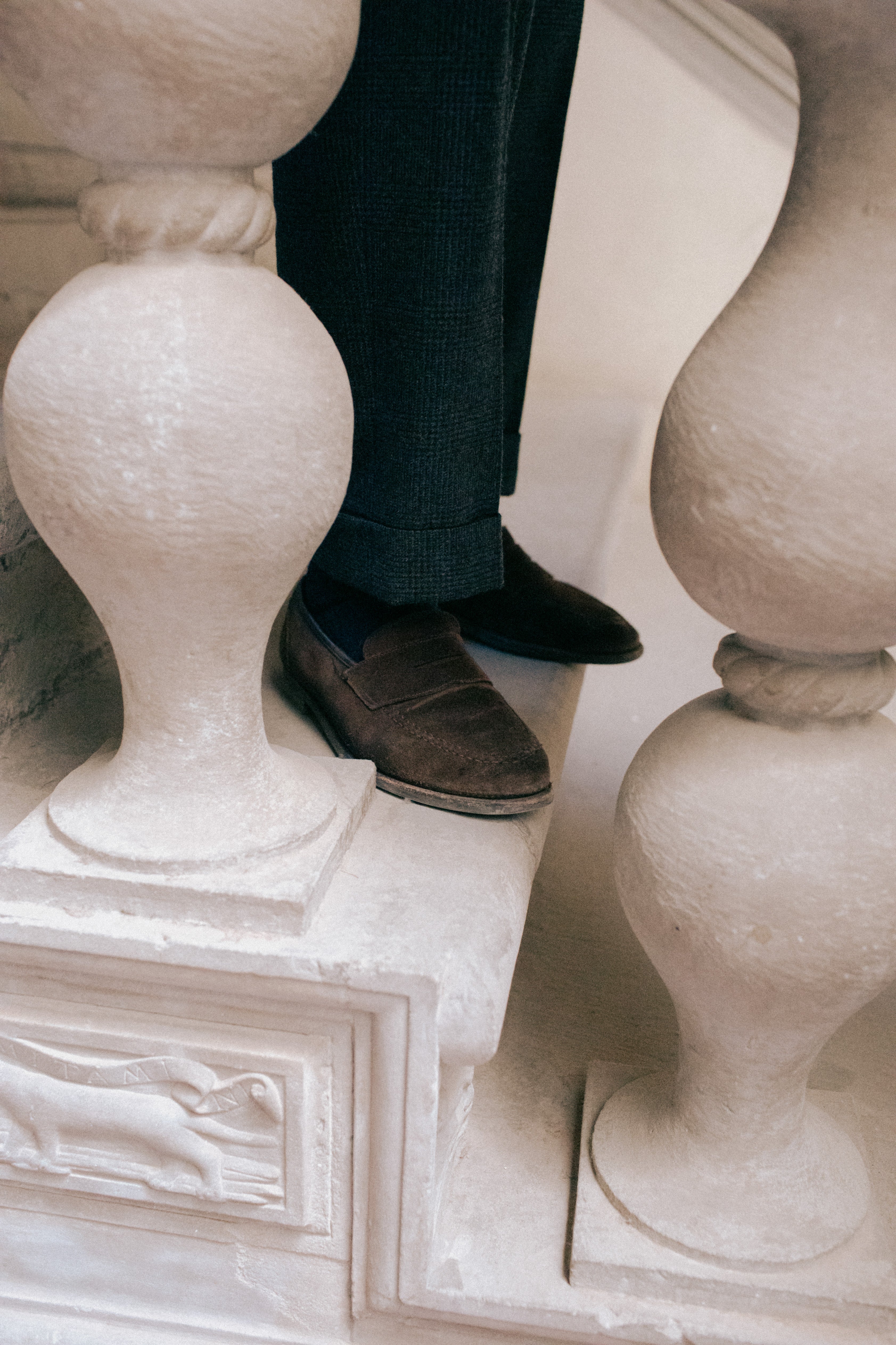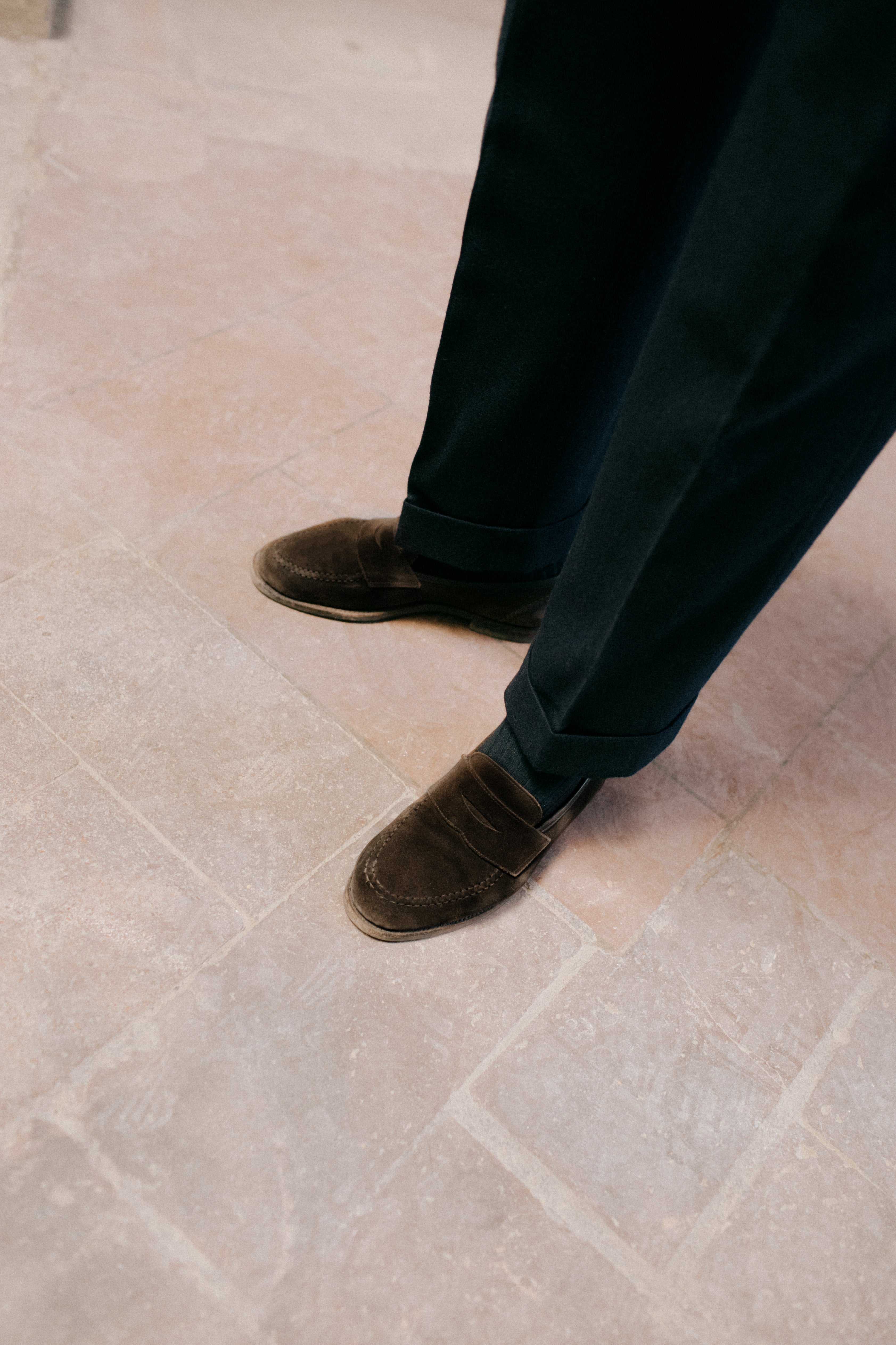 Fabio wears a Navy Double Breasted Martingala Coat, MTM Single Breasted Jacket in Grey Herringbone Tweed, Light Wash Spread Collar Denim Shirt, Charcoal Cashmere Roll Neck, 5-Pocket Olive Moleskin Trousers and Crockett & Jones for Anglo-Italian Unley Brown Suede Loafers.