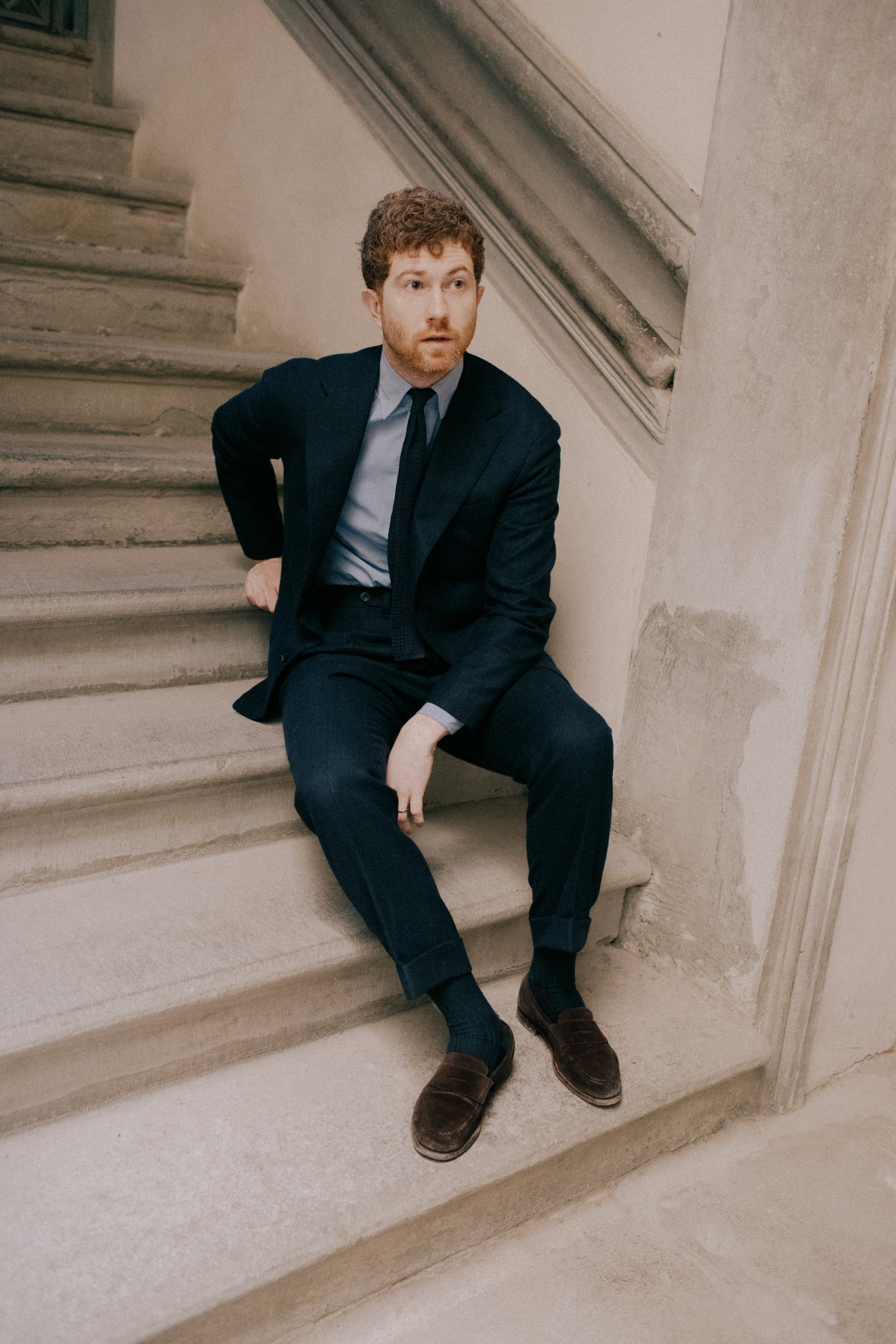 Jake wears an MTM Single Breasted Jacket in AIT-149, Navy Wool Raglan Sleeve Polo, MTM Navy Moleskin Tailored Trousers and Crockett & Jones for Anglo-Italian Unley Brown Suede Loafers.