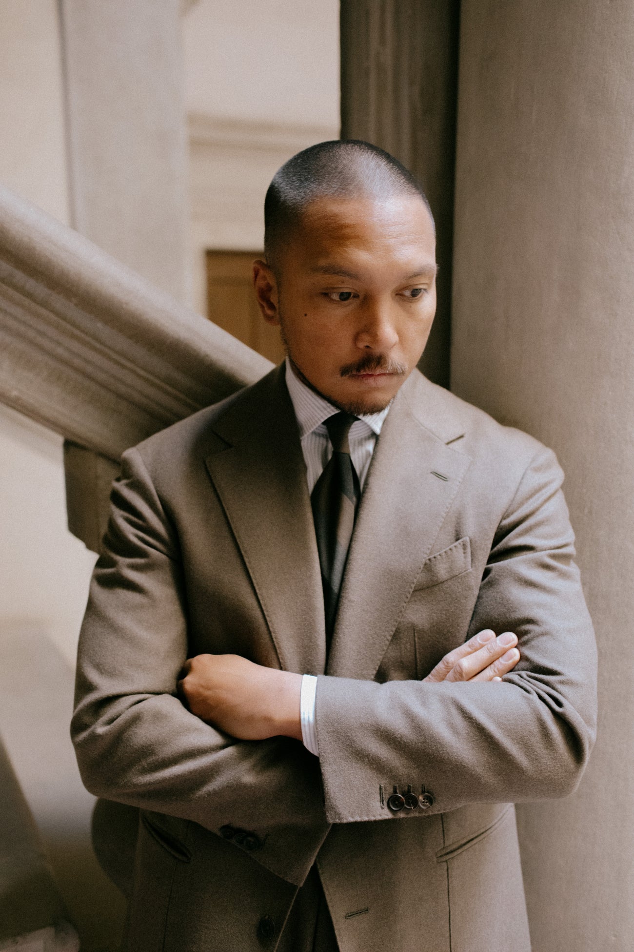 Martin wears an MTM Single Breasted Suit in Dark Tan Flannel, MTM Grey Stripe White Cotton Poplin Spread Collar Shirt, Gold Grey Black Stripe Dry Silk Tie and Crockett & Jones for Anglo-Italian Unley Brown Suede Loafers.