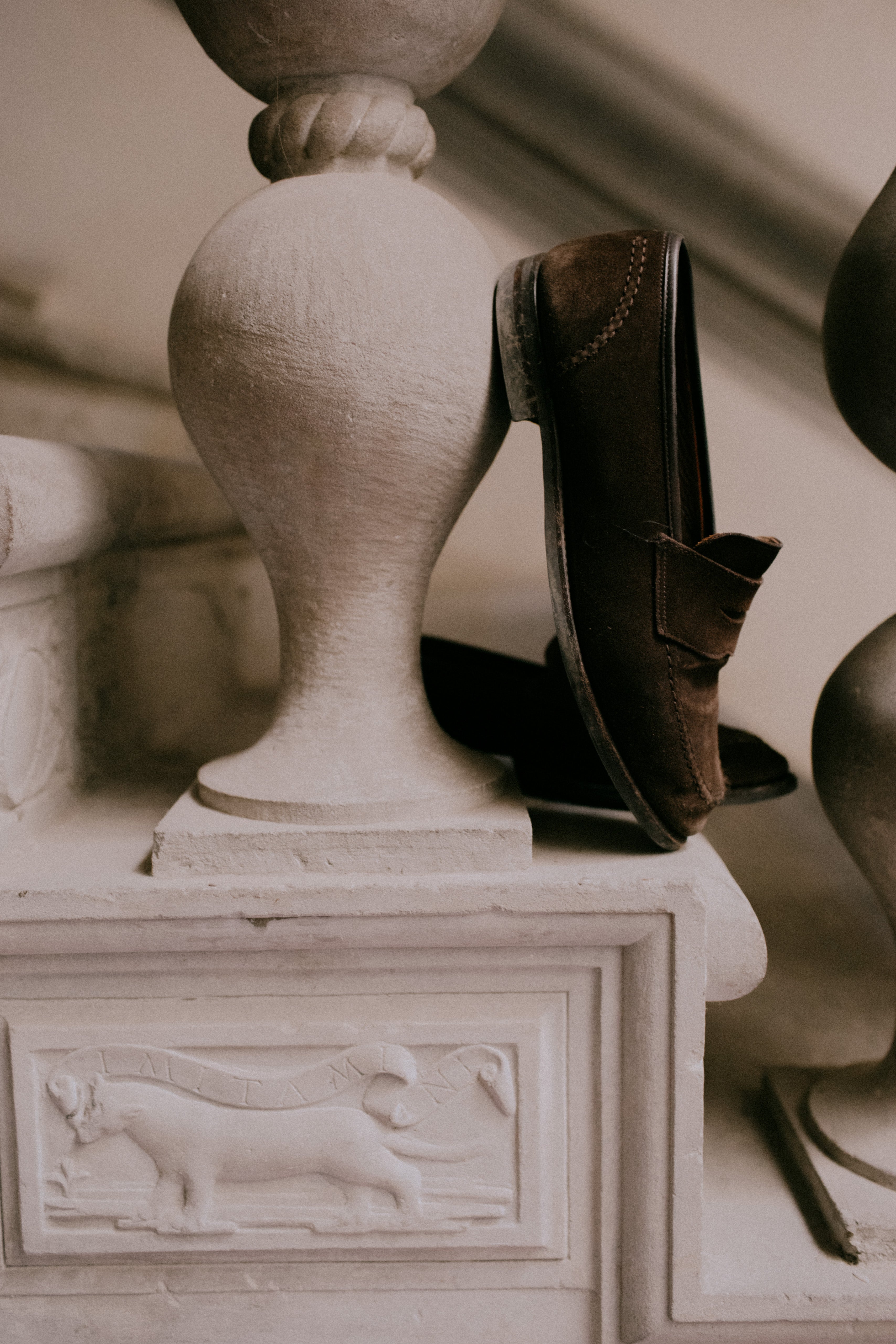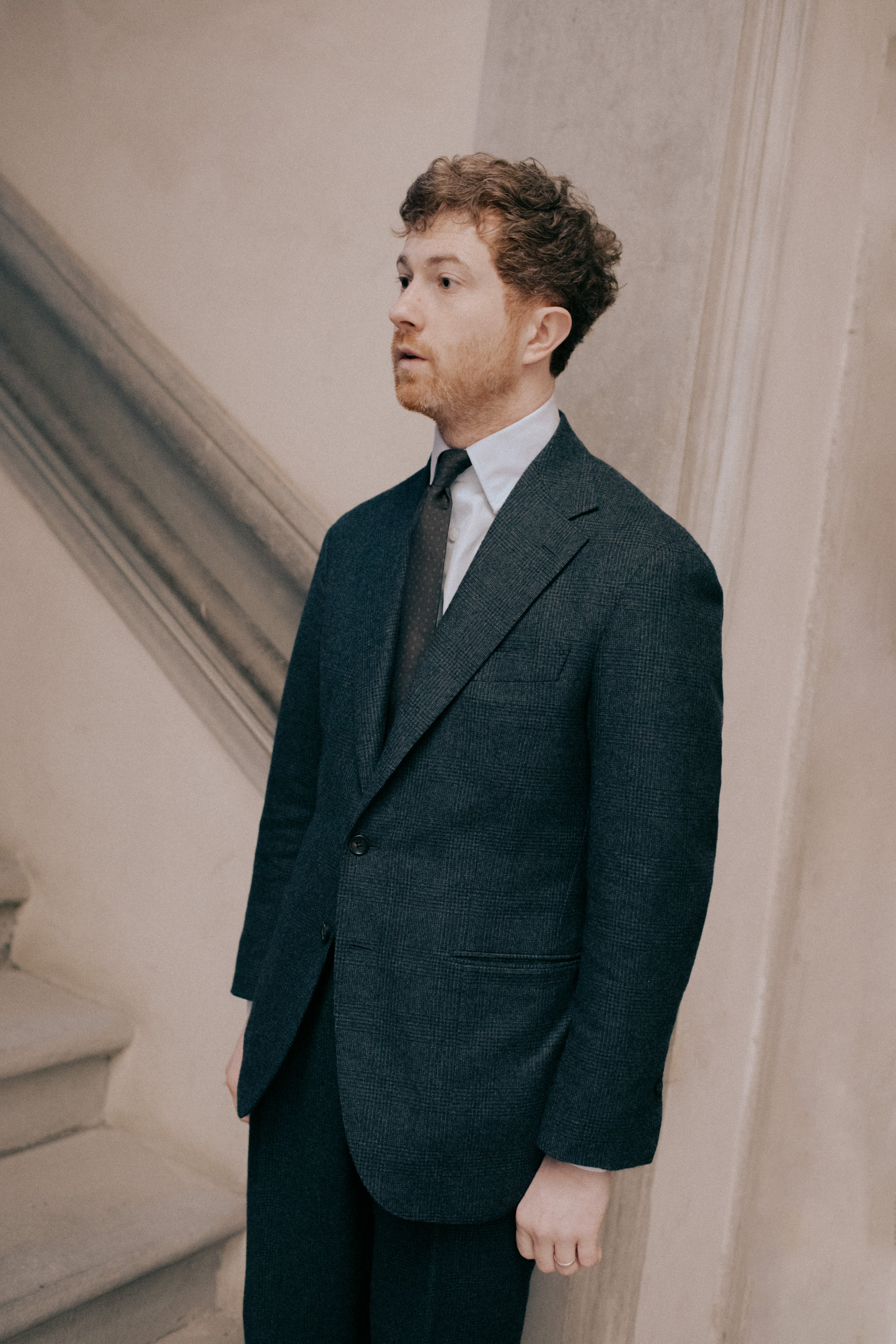 Martin wears a MTM Single Breasted Jacket in Sand Shetland Tweed, Reverse Stripe OCBD Shirt, Navy Wool Knit Tie, MTM Mid-Grey Flannel Tailored Trousers and Crockett & Jones for Anglo-Italian Unley Brown Suede Loafers.