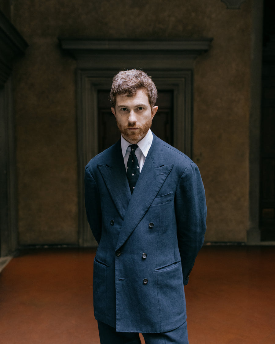 Jake wears a Bespoke Double Breasted Suit in Navy Twisted Wool-Linen, White Poplin Point Collar Shirt and Crockett & Jones for Anglo-Italian Studridge Brown Suede Loafers.