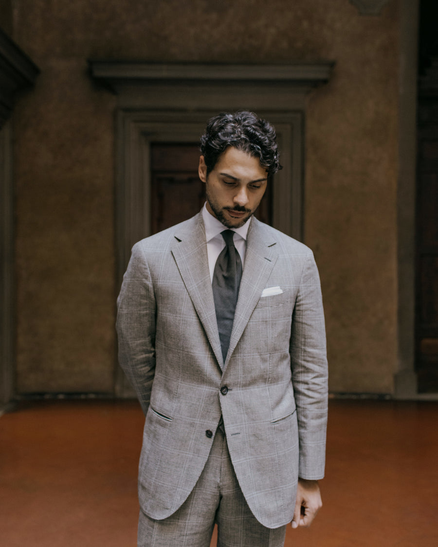 Fabio wears a Made-To-Measure Suit in Grey Glen Plaid Wool-Linen, White Poplin Spread Collar Shirt, Grey Dry Silk Tie and Crockett & Jones for Anglo-Italian Unley Brown Suede Loafers.