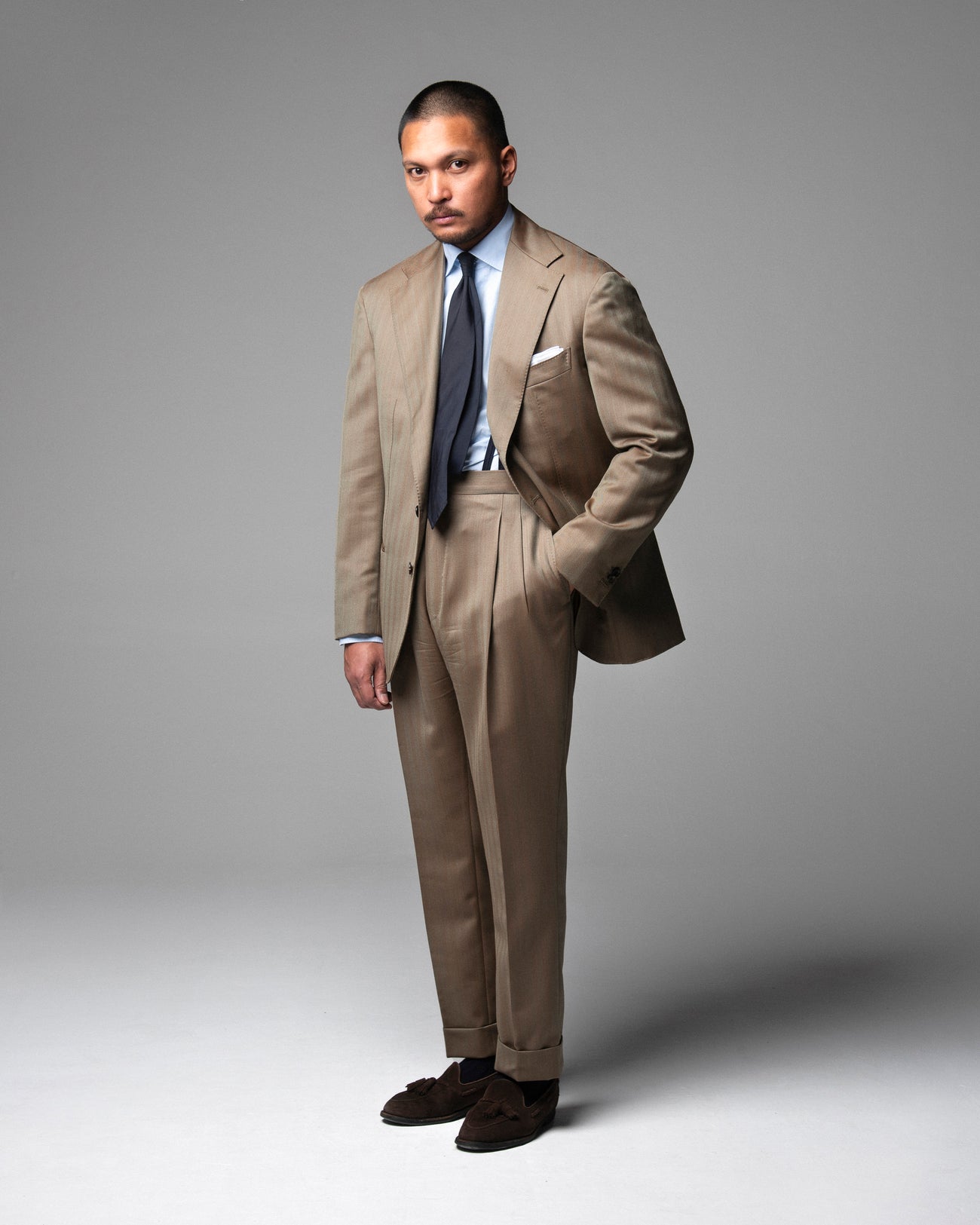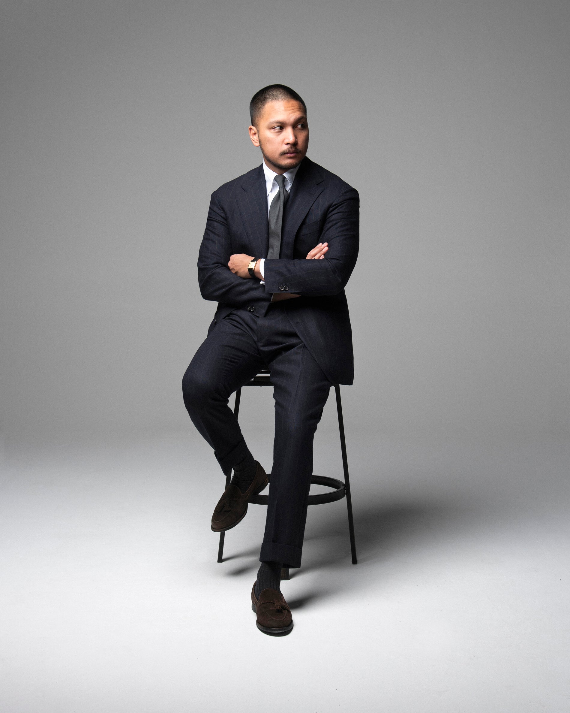Jeremy wears a Made-To-Measure Double Breasted Suit in Charcoal High-Twist Wool, Blue Stripe Made-To-Measure Point Collar Shirt, Navy Steel Stripe Dry Silk Tie and Crockett & Jones for Anglo-Italian Burlington Brown Suede Oxfords.