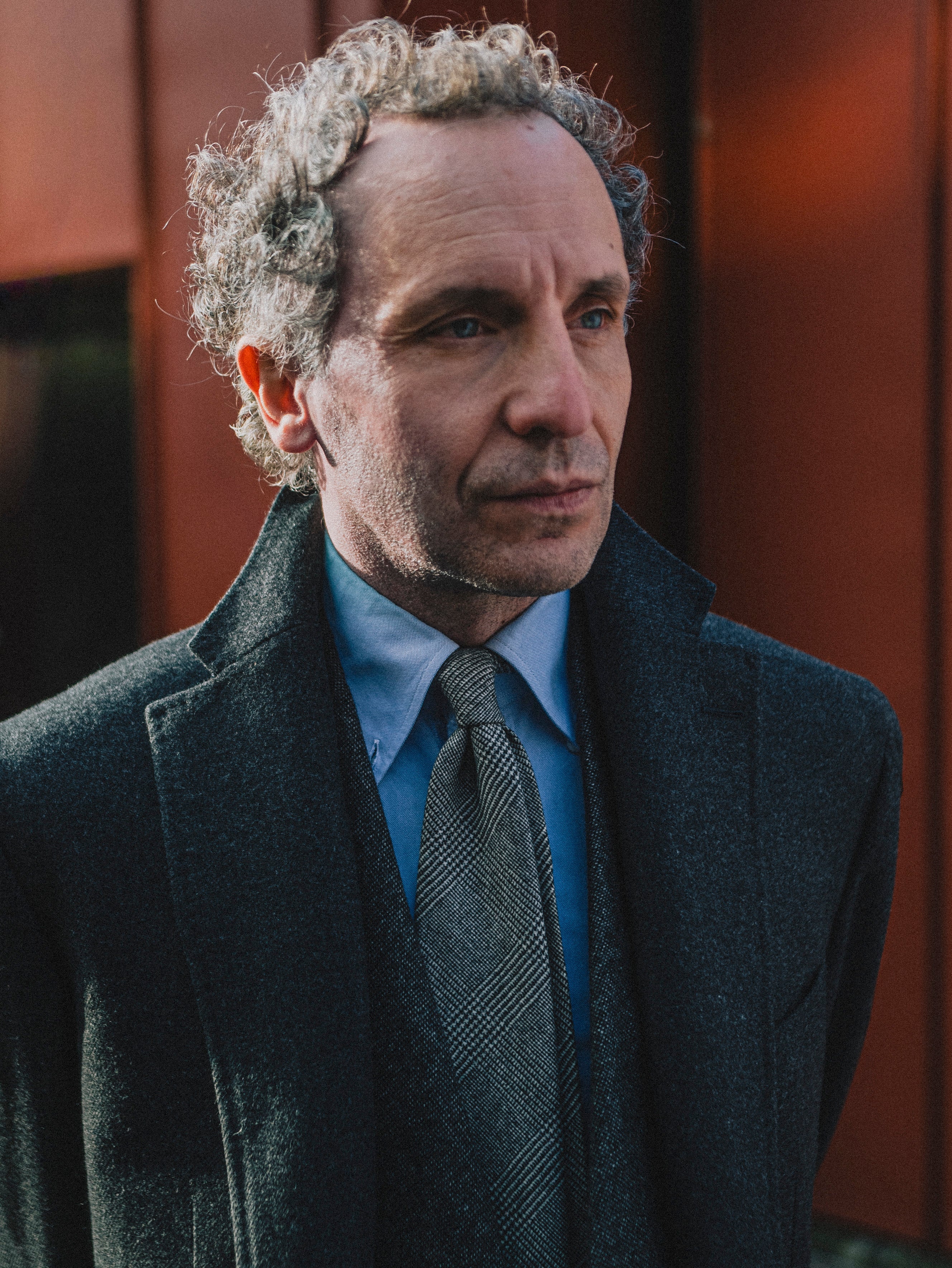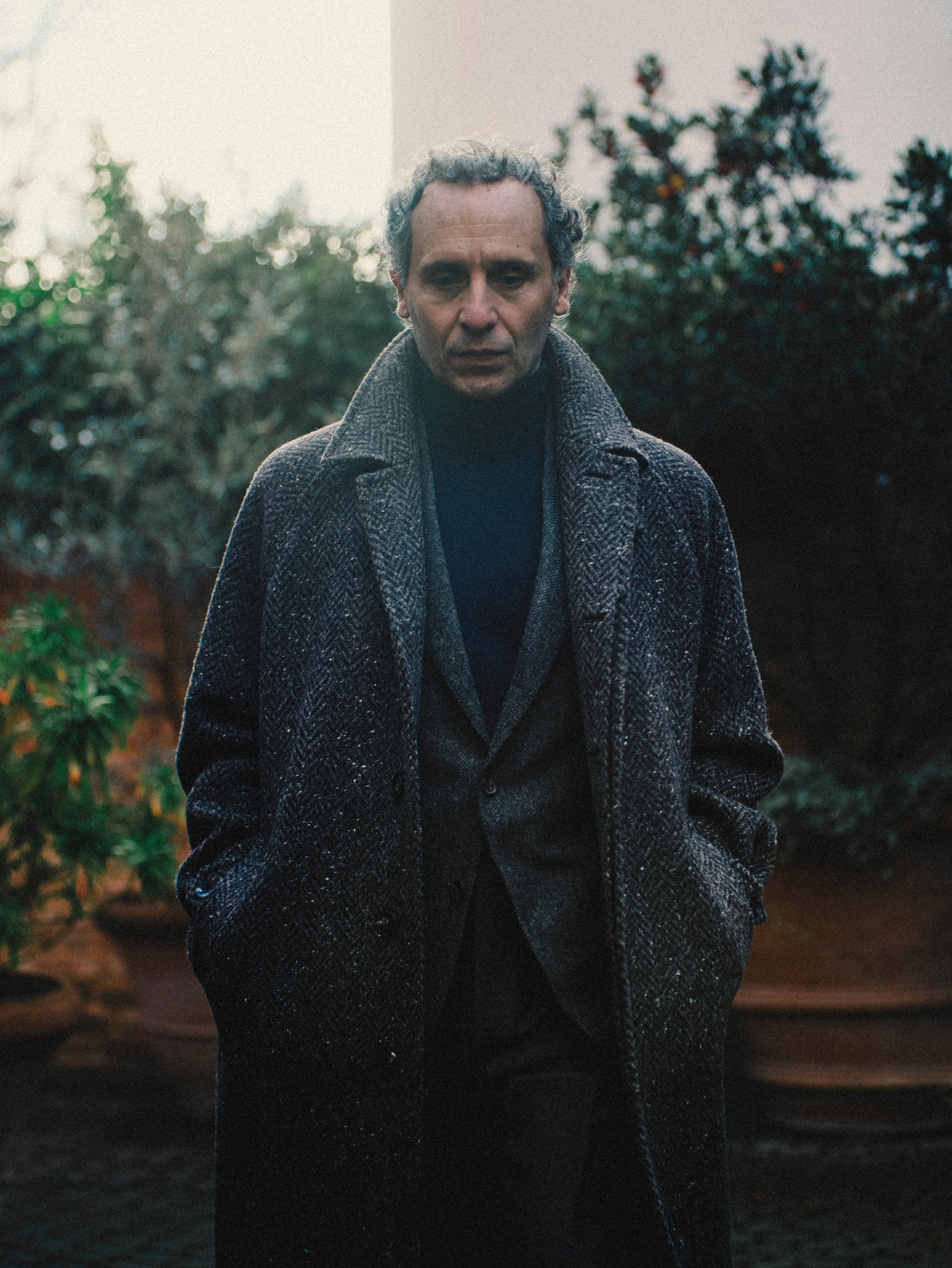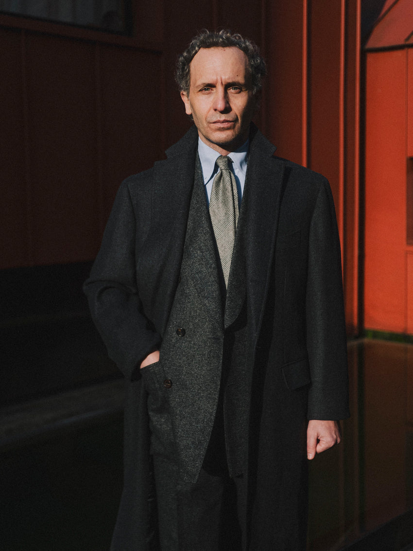 Double Breasted Overcoat Peak Lapel Navy, Point Collar Shirt Cotton Poplin White Blue Hairstripe, Charcoal Windowpane Flannel Double Breasted Suit, Tie Wool-Cashmere Navy.