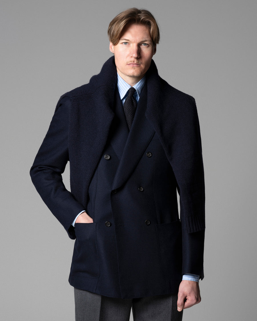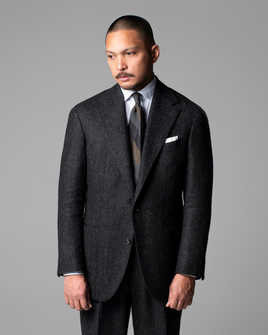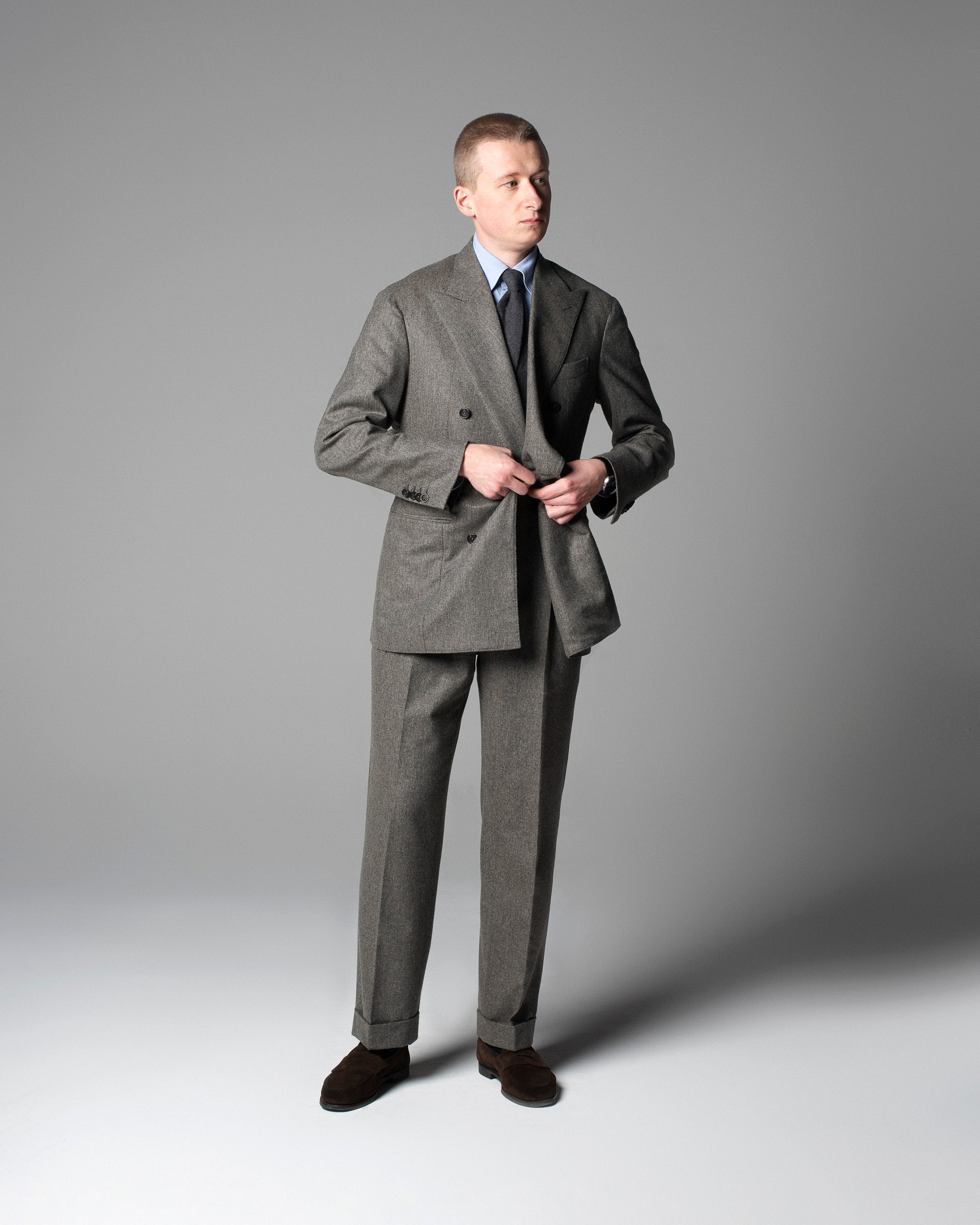 For this season the team relied heavily on flannel suitings in unusual tones, washed out chalk stripes and tonal glen plaids, as well as our usual mix of milled birdseyes and chunky jacketings for a refined seasonal palette of navy, grey, green and brown.
